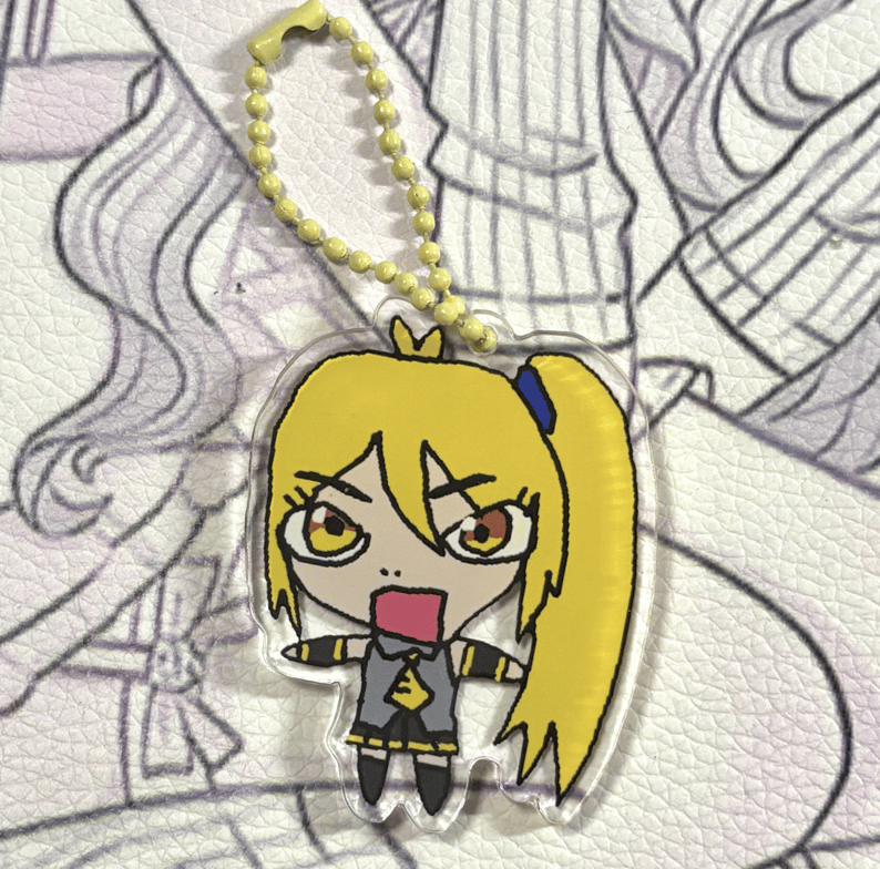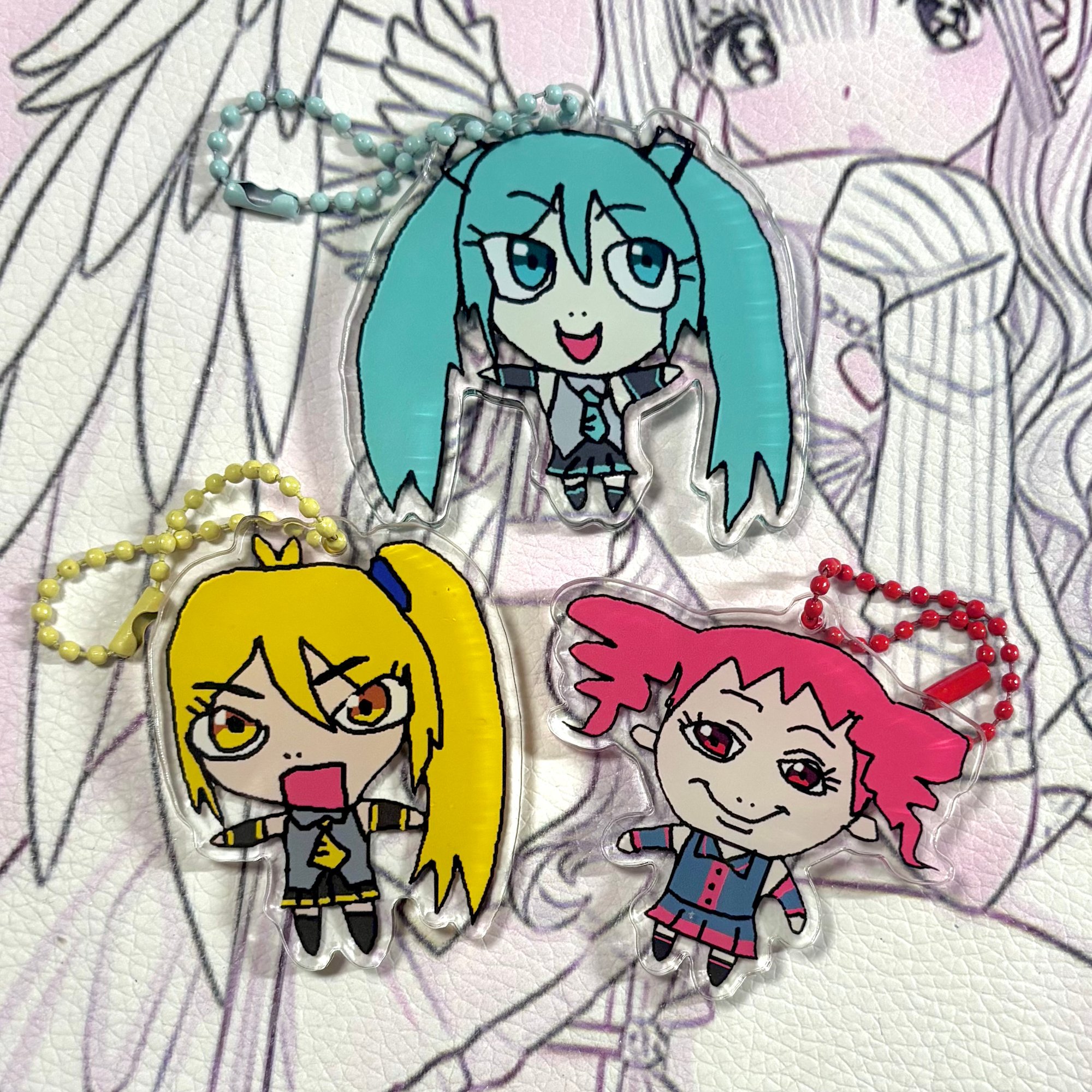 Badly-drawn acrylic keychains of Hatsune Miku, Kasane Teto, and Akita Neru! They will be double-sided and made of clear acrylic, with a ball bead chain attachment!